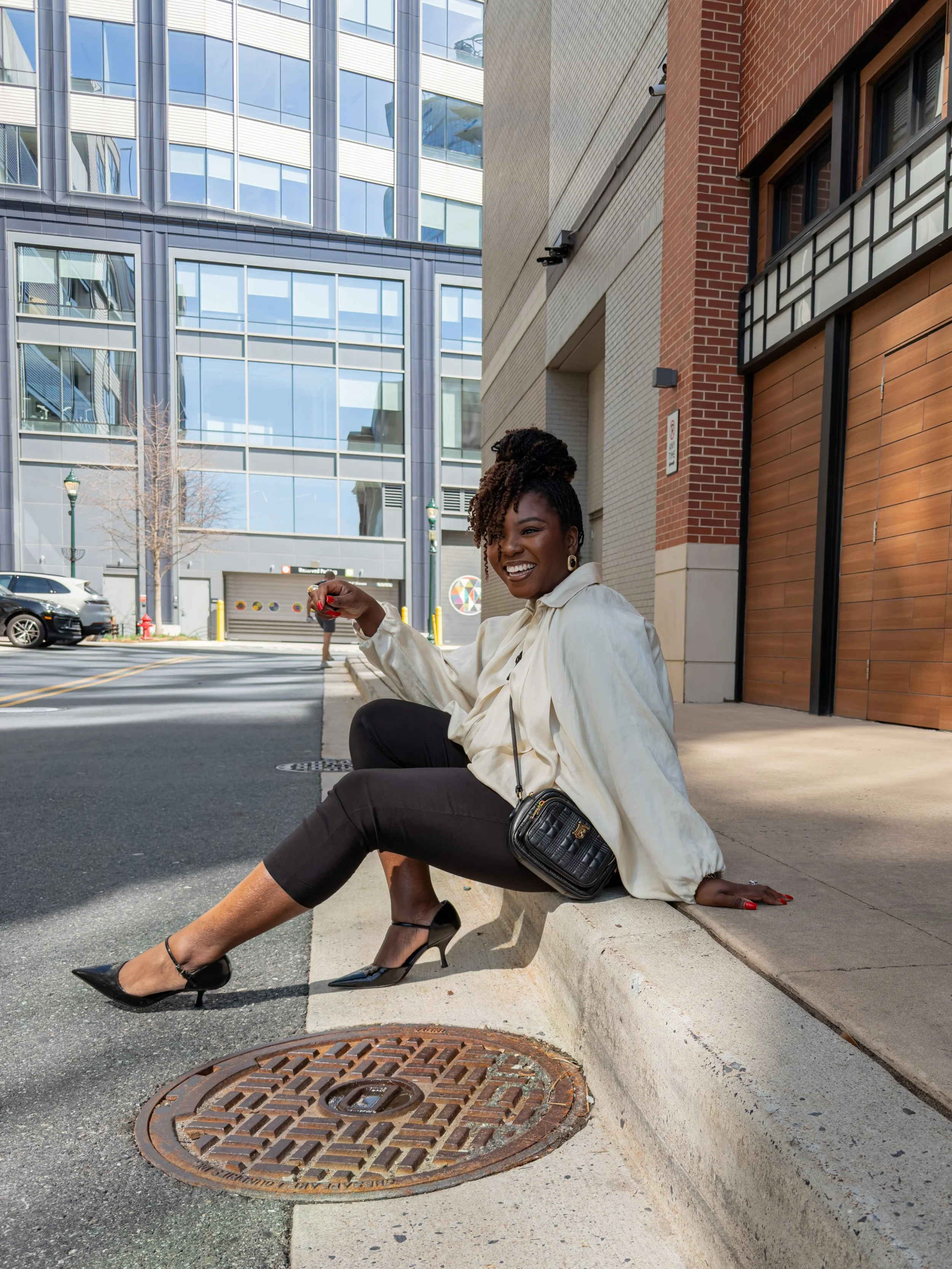 The patent kitten heel slingback is the quiet power move of this outfit. It’s feminine without being precious, polished without trying too hard. The low heel keeps it wearable for a full day, and the patent finish adds just enough shine to catch the light. This is the shoe that elevates the entire look from “running errands” to “she’s a stylist.”